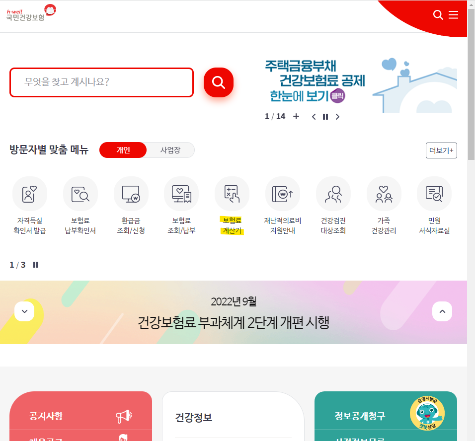 접속을 하게 되면 아래 화면이 나오는데, 여기서 5번째에 있는 '보험료 계산기'를 클릭합니다.